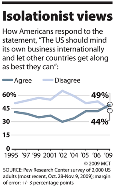 The sour economy is one explanation for the isolationist spike, but so is disappointment and fatigue over the results of eight years of aggressive foreign policy under President Bush, analysts of the public's views of the world say.