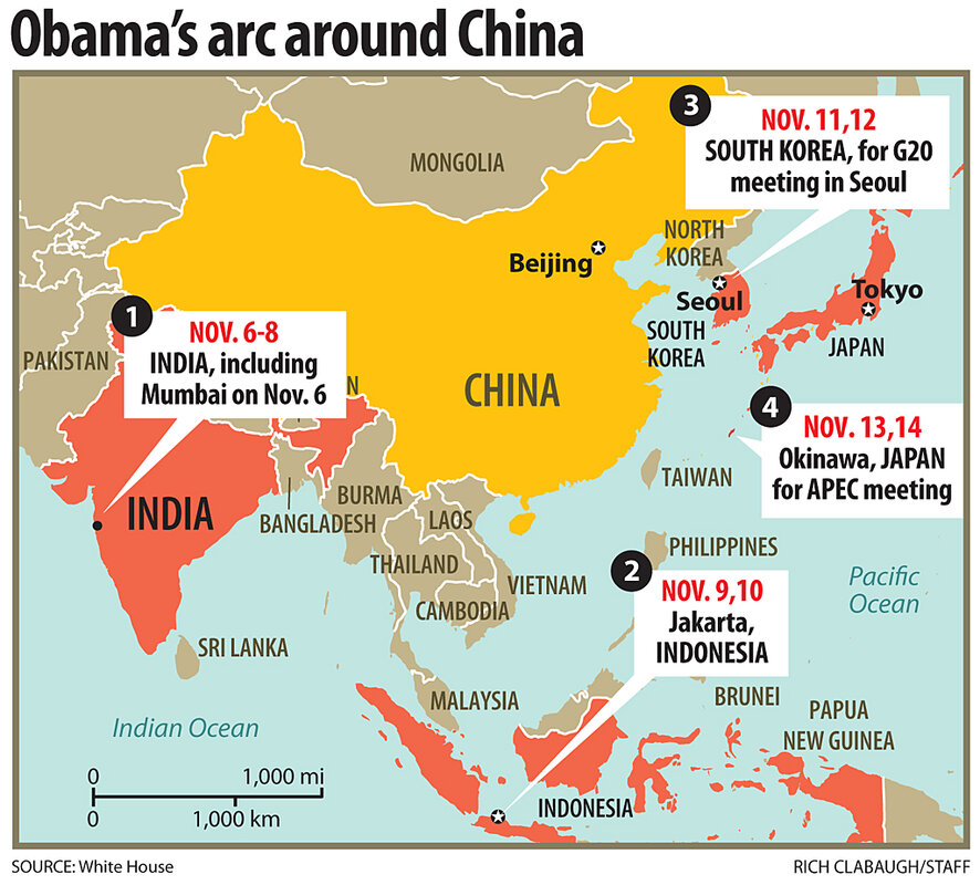 Mr. Obama will not touch down on Chinese soil, but at every stop he does make 鈥 from India to Japan, with Indonesia and South Korea in between 鈥 China and its economic, political, and military rise will either explicitly or implicitly figure on the agenda.