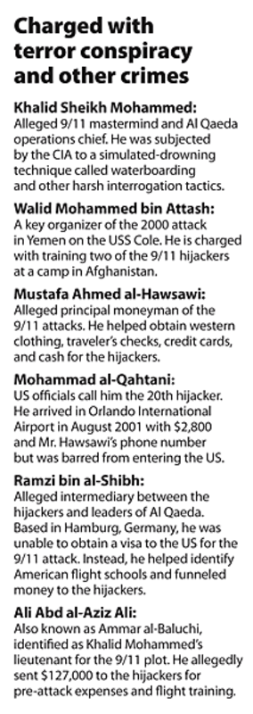 Among the defendants is Mohammad al-Qahtani, said to have been Al Qaeda's chosen 20th hijacker. Mr. Qahtani was reportedly unable to enter the US to participate in the attacks after an alert official questioned him at Orlando International Airport.