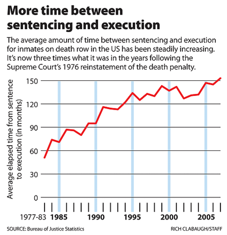With approximately 68 months between his sentencing and scheduled execution, Muhammad's case has taken roughly half the typical duration for death-penalty cases. Nationally, it takes on average 153 months 鈥 almost 13 years 鈥 between sentencing and execution for death-row inmates, according to 2007 data from the Bureau of Justice Statistics.