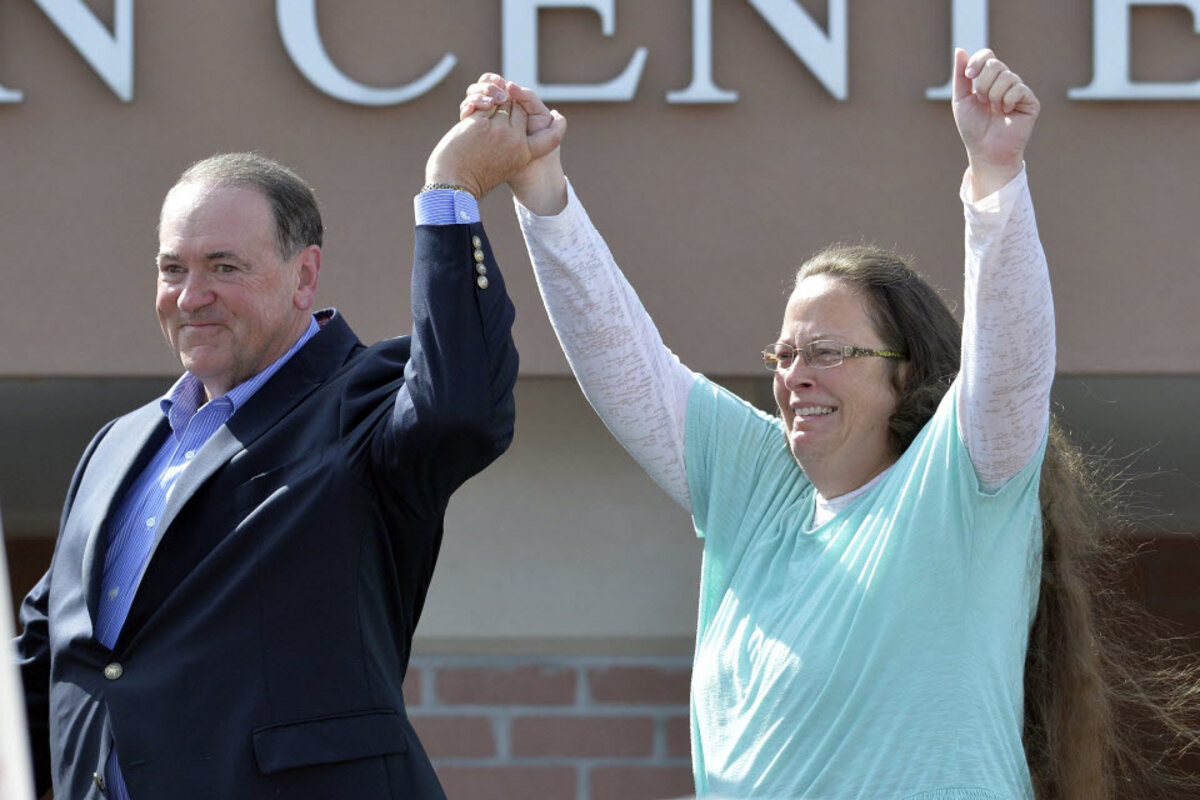 Davis’ first stint in prison ended in a spirited press conference-cum-rally led by Republican presidential hopeful Mike Huckabee, capitalizing on Davis’ now-iconic status among some social conservatives as a defiant martyr for religious liberty. As Huckabee escorted Davis to the stage, to the sound of "The Eye of the Tiger," he pledged, “If somebody needs to go to jail, I am willing to go in her place, and I mean that.... we cannot criminalize the Ǵ faith or any faith in this country.”