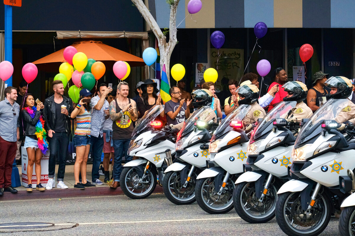 Although officials in Los Angeles considered canceling the parade, which drew a crowd of thousands, they ultimately opted for extra security. The tone at the parade was both celebratory and mournful, and began with a moment of silence.
