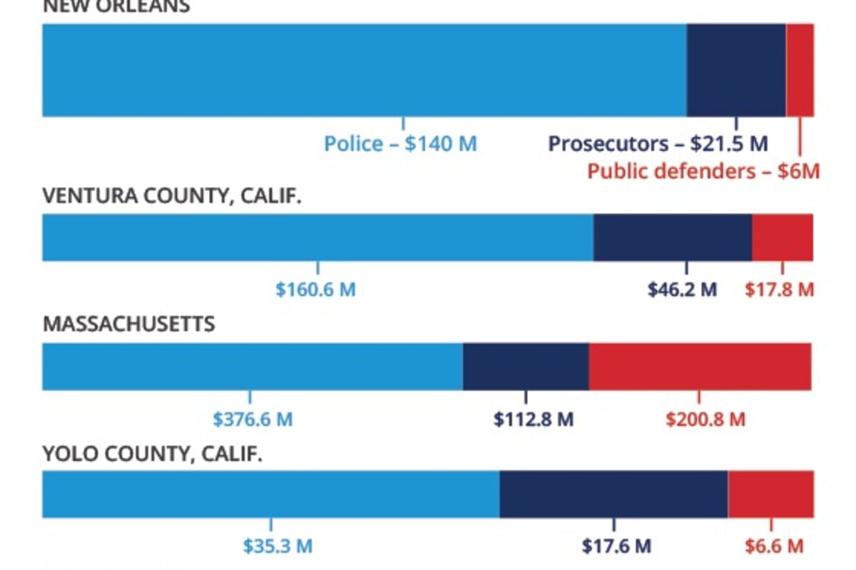 Orleans Public Defenders has a $6 million budget and about 82 full-time employees. The Orleans Parish District Attorney鈥檚 Office has a $14.5 million budget and 210 employees. The New Orleans Police Department receives $140 million.