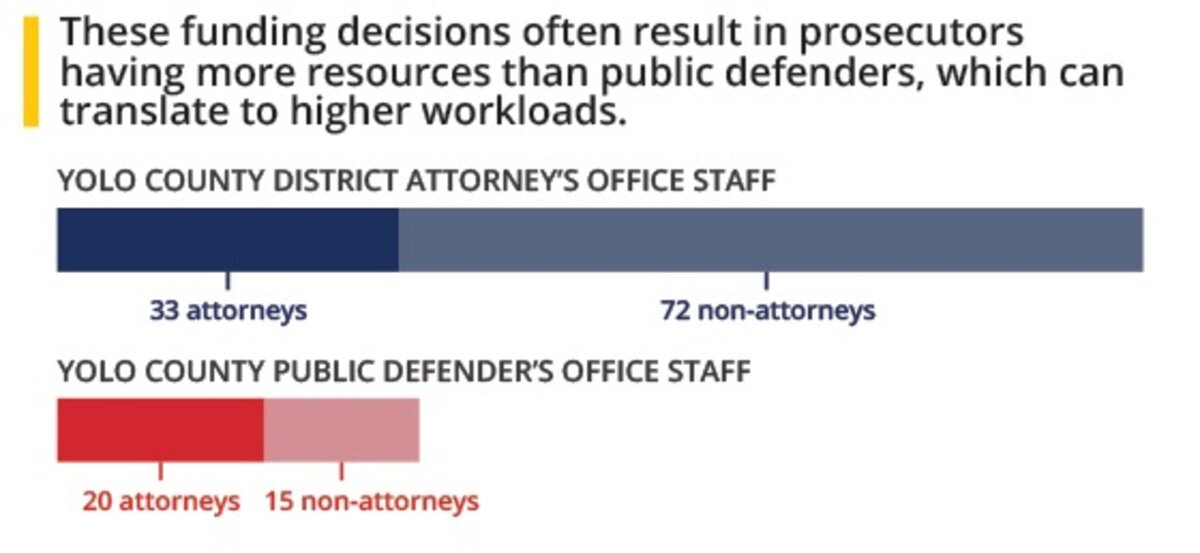 In Yolo County, Calif., the public defender office has its own agreement with the county administrator鈥檚 office: For every three criminal prosecutor positions the district attorney adds, the county will fund two new public defender positions.