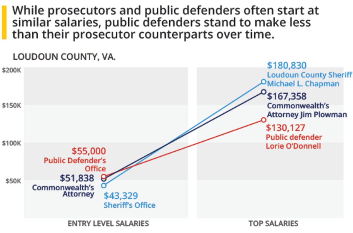 [Editor's note: The original story gave incorrect information about the number of full-time employees in the聽Orleans Public Defenders office. It also had incorrect information in a chart about the salaries of Loudoun County, Va., public defenders and prosecutors.]