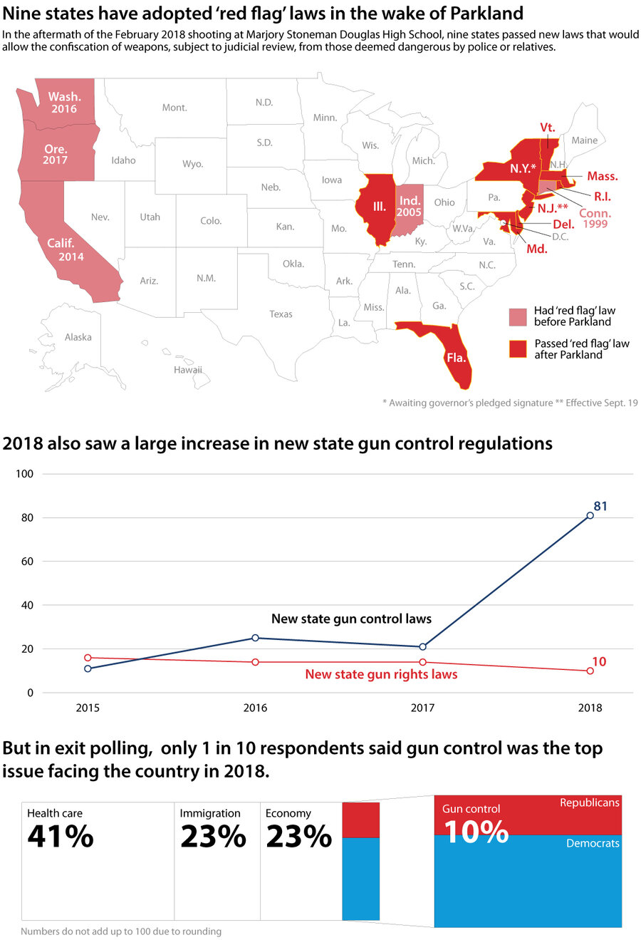 Since the shooting in Parkland, Fla., one year ago today, nine states (for a total of 14) have implemented “red flag” laws that allow temporary seizure of weapons for a range of reasons, from domestic battery to social media threats. Authorities carried out at least 1,700 such seizures last year.