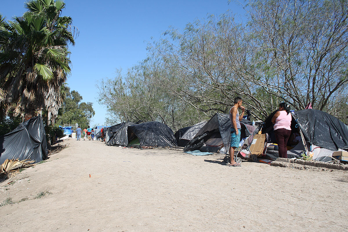 Tents sprawl out under silk trees from the road to the bank of the Rio Grande, filling soccer pitches and a basketball court. Goal posts are now clothing lines. Smoke drifts up from small wood stoves and camp fires. Some people have been there for 10 months.