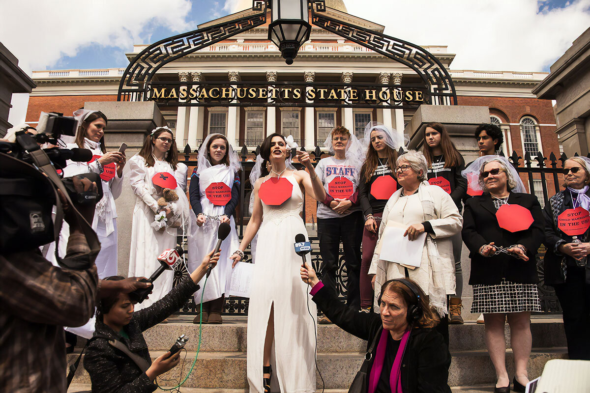 Aside from meeting with lawmakers and traveling the country to raise awareness about child marriage, Ms. Reiss and other supporters of Unchained at Last will frequently protest in front of statehouses dressed in bridal gowns and veils, with chains around their wrists.
