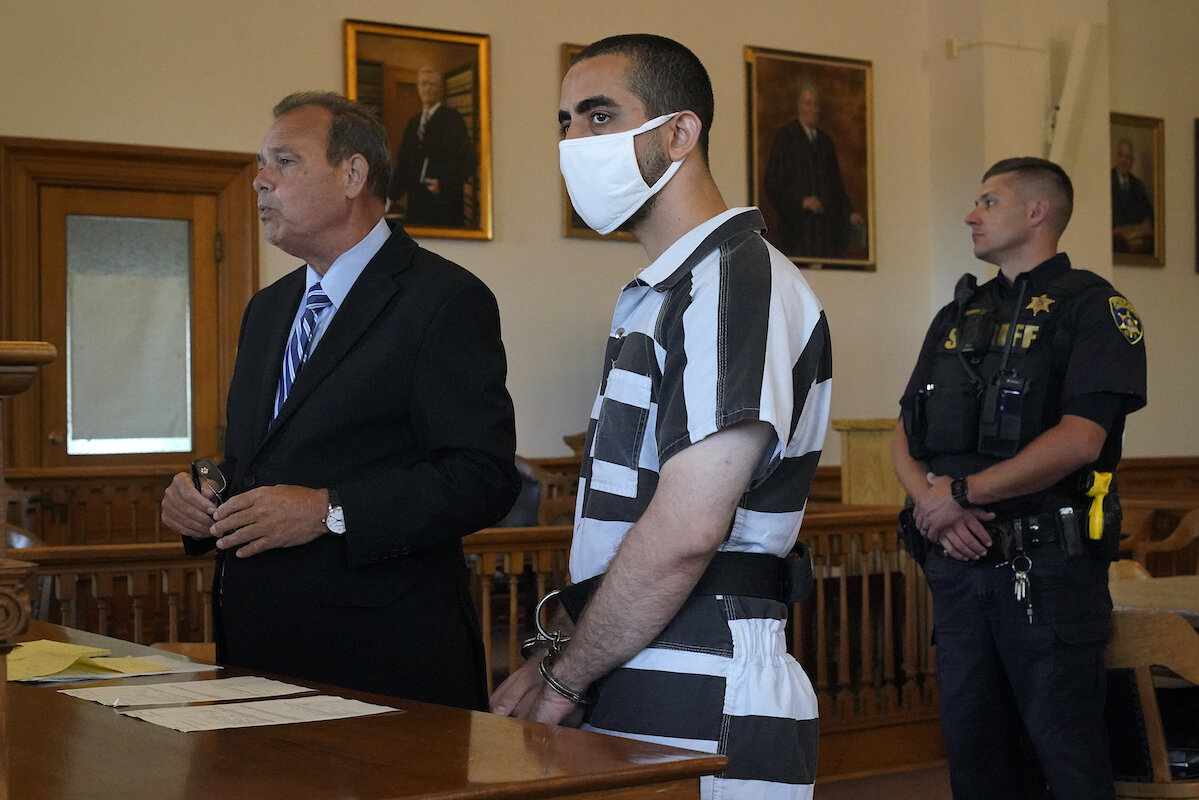 An attorney for Hadi Matar entered the plea on his behalf during an arraignment in western New York. The suspect appeared in court wearing a black and white jumpsuit and a white face mask, with his hands cuffed in front of him.