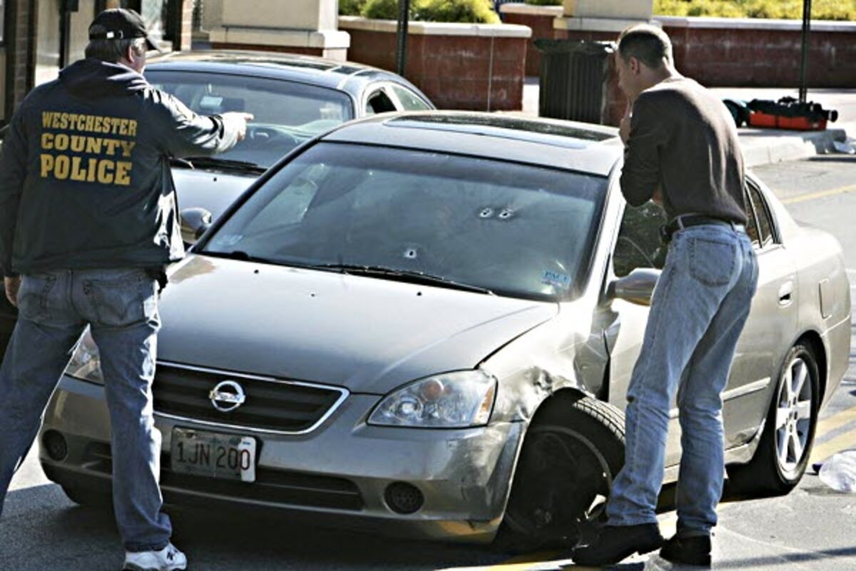 The gray sedan sat Sunday outside the restaurant with three bullet holes in the windshield, its driver's-side front wheel askew and dents in the front panel.