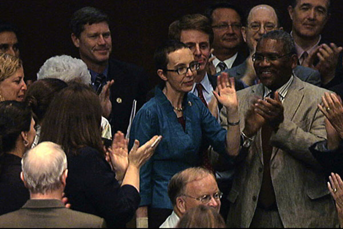 Democrats crowded around her as she mouthed "thank-you's." She used one hand to greet some, the other by her side. Her hair was dark and closely cropped, and she wore glasses. Her image was quite different from the one Americans saw seven months ago when she was sworn-in by House Speaker John Boehner, R-Ohio.