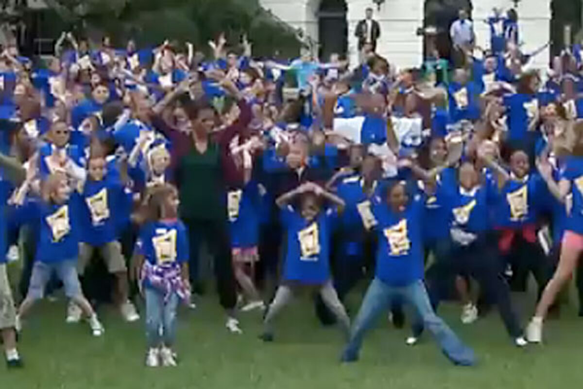 In order to achieve her goal, Mrs. Obama led 464 elementary and middle-school students from Washington in jumping jacks on the South Lawn of the White House. Other jumping jacks events were held around the world on Oct. 11.