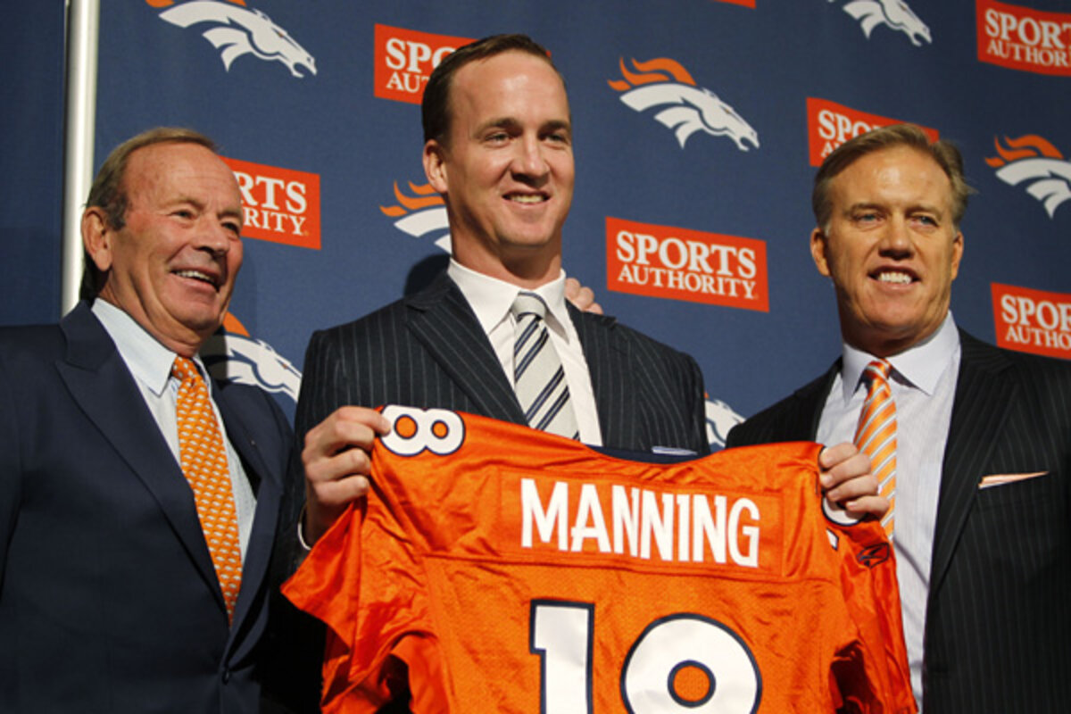 Manning was introduced as the new quarterback of the Denver Broncos on Tuesday, the four-time MVP taking the spot once held by Elway, who as Broncos vice president engineered the deal to bring the NFL's most sought-after free agent to town.