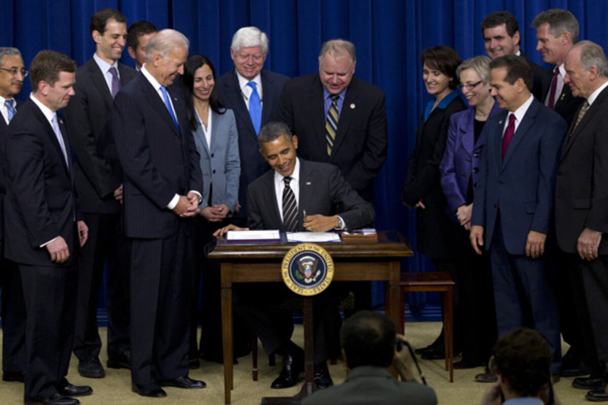 Obama was joined by several lawmakers who pushed the bill through Congress, including Massachusetts Sen. Scott Brown, a Republican who has been targeted by Democrats and is expected to face a stiff challenge from Elizabeth Warren, a Harvard professor who helped launch the new federal Consumer Financial Protection Bureau.