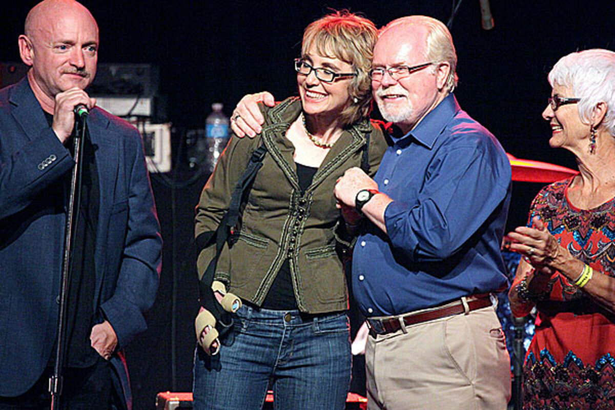 Giffords attended a concert Saturday night and listened as her husband, astronaut Mark Kelly, spoke on her behalf in praising Barber, who was wounded in the shooting. The couple met Sunday with volunteers to thank them for their work.