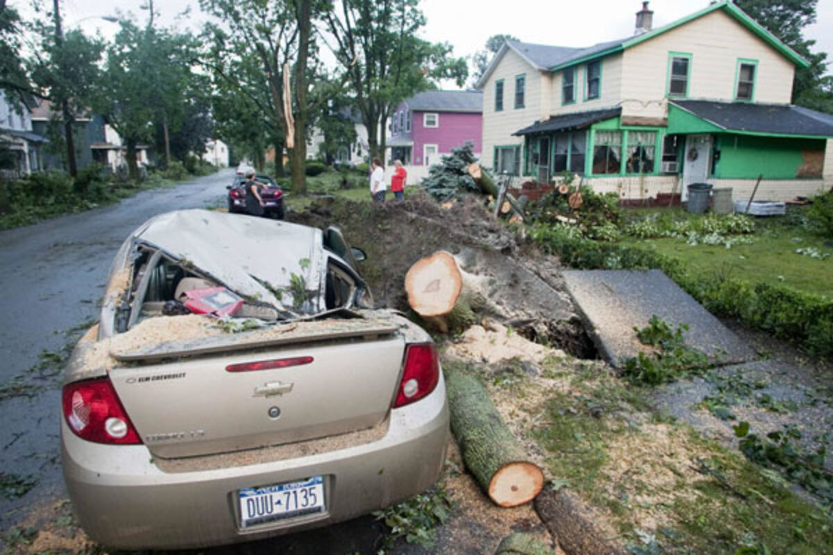 Communities around the Northeast are cleaning up after strong thunderstorms swept from Ohio into upstate New York, knocking out power to tens of thousands and leaving at least two people dead.