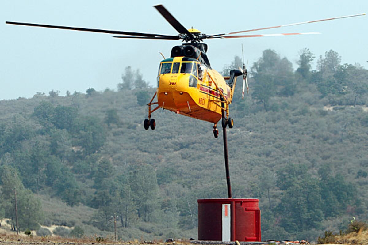 Air tankers and helicopters flew repeatedly into a deep rim rock canyon to douse the spearhead of the massive Ponderosa wildfire in Northern California and stop it from driving into a nearby mountain community and Lassen Volcanic National Park.