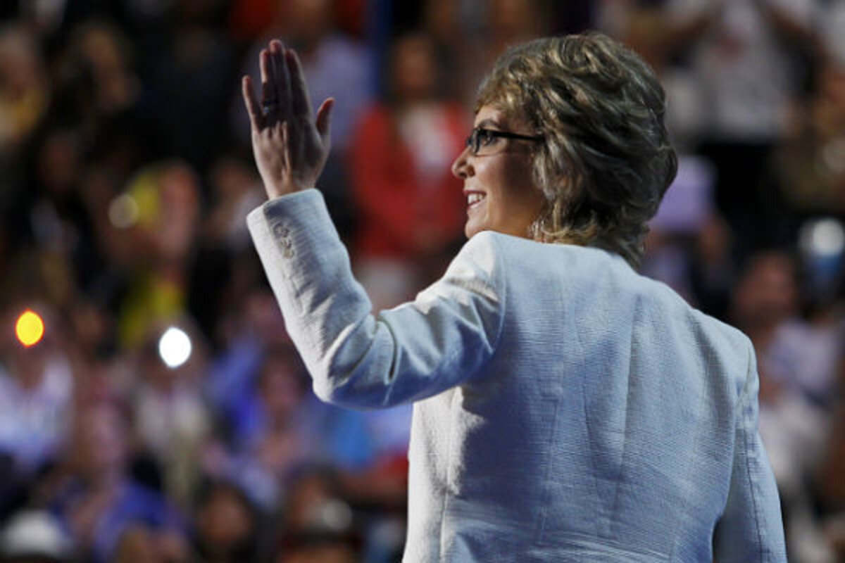 To deafening cheers, the former congresswoman walked tentatively onto the stage 1陆 years after being shot in the head in an attack in her district in Tucson, Ariz., that killed six and injured 13. On Thursday night, Democrats in the arena grinned, and some wept openly, as聽Giffords聽summoned a clear and emphatic voice: "I pledge allegiance ..."