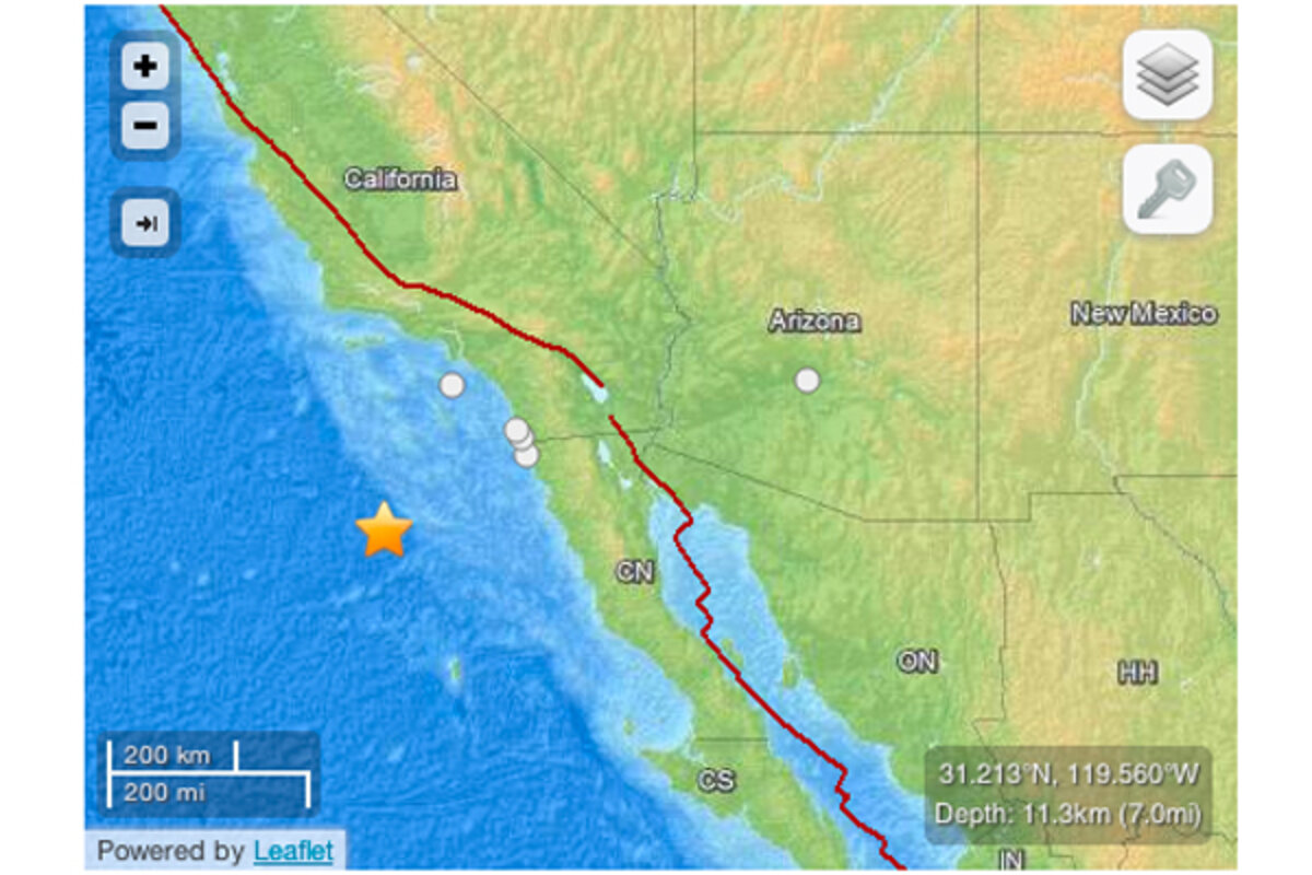 The quake, with a preliminary magnitude of 6.4, was recorded at 2:36 a.m. (1036 GMT) Friday, 163 miles (262 kilometers) south southwest of the California city of Avalon and 167 miles west southwest of Rosarito, Mexico.