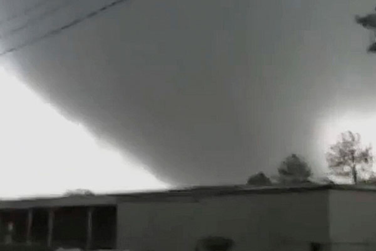 WSB-TV in Atlanta aired footage showing an enormous funnel cloud bearing down on Adairsville, about 60 miles northwest of Atlanta, as the storm ripped through the city's downtown area. The system flattened homes and wiped out parts of a large manufacturing plant. Pieces of insulation hung from trees and power poles, while the local bank was missing a big chunk of its roof.