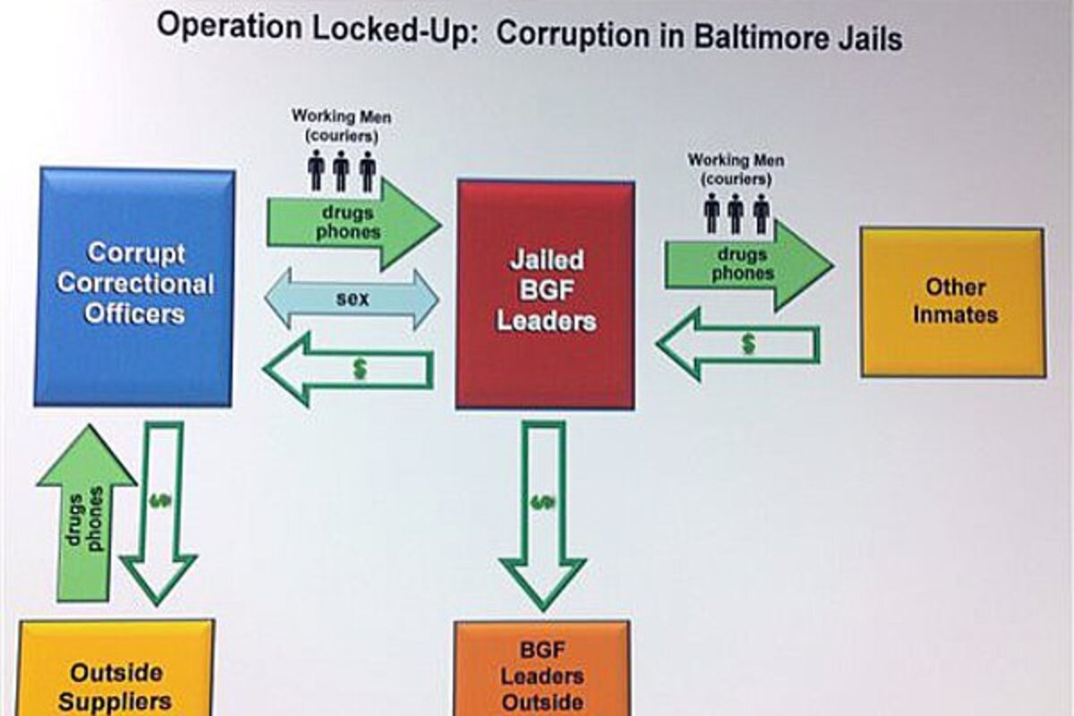 An indictment unsealed Tuesday claims that the聽Black聽Guerilla聽Family聽gang ran the scheme from inside the Baltimore City Detention Center and charges gang members and corrections officers with conspiracy, drug possession and distribution, and money laundering.