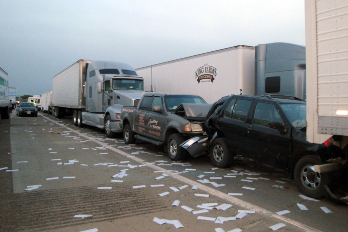 High winds at about 5 p.m. Monday whipped up dust 鈥 possibly loose from recently cleared fields 鈥 and created whiteout-like conditions, authorities said. Vehicles, including semitrailers, passenger cars and a tow truck piled up in both directions and shut down the highway, which is a major trucking corridor.
