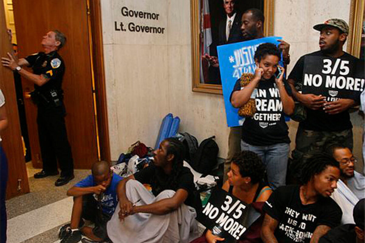 Protesters upset that Zimmerman was acquitted of second-degree murder and manslaughter charges in the 2012 shooting death of 17-year-old Trayvon Martin marched on the Capitol on Tuesday and began occupying Scott's office.