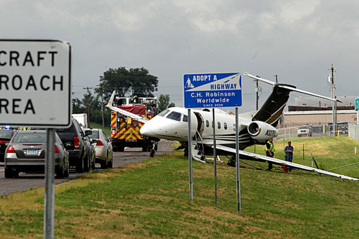 Police say the Embraer Phenom 300 came to a stop on the shoulder of Flying Cloud Drive just before 9 a.m. Monday. The southbound lanes of the road were closed for several hours, but the airport soon reopened.