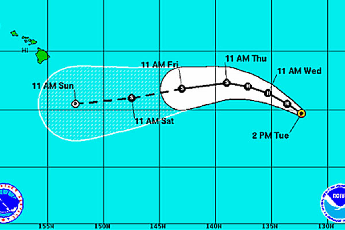 The hurricane is centered about 1545 miles (2485 kilometers) east-southeast of the Hawaiian islands and is moving west-northwest near 10 mph (17 kph). Hurricane-force winds extend outward up to 25 miles from the eye of the storm. .And tropical-storm-force winds extend outward up to 80 miles from the center.