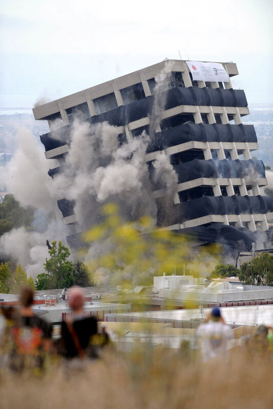 With a series of quick blasts and a cloud of dust a 13-story building on the Cal State-East Bay campus crashed to the ground Saturday morning as scientists monitored the impact on the nearby Hayward Fault.