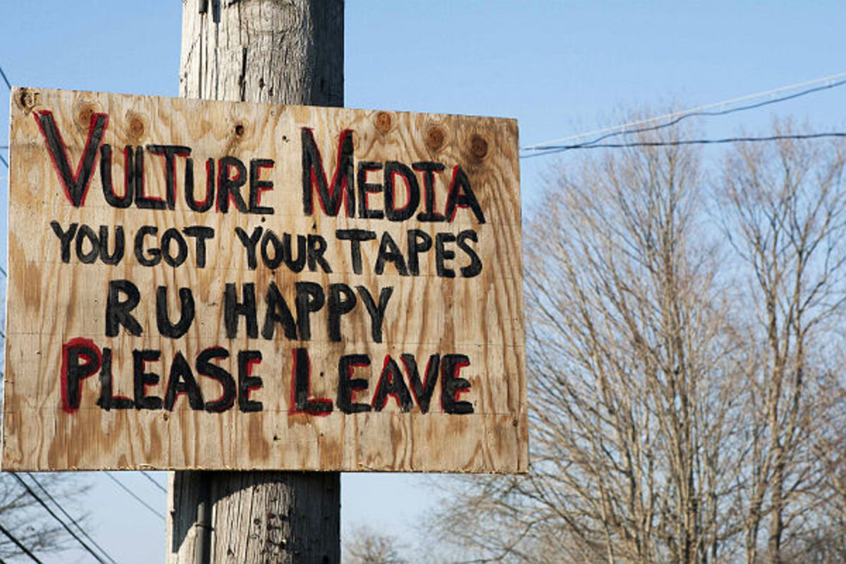 "Vulture media, you got your tapes," read a hand-painted sign on a telephone pole in Newtown聽on Wednesday. "Please leave."