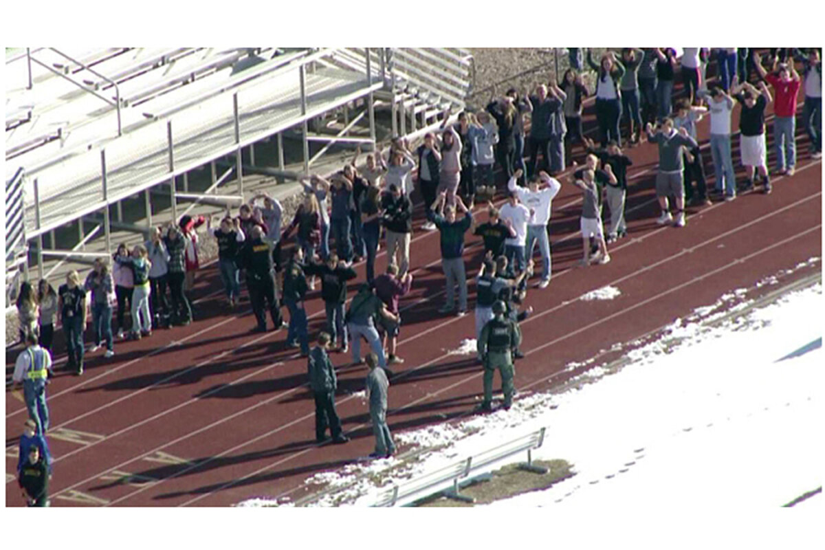 Television images from the high school show students running out with their hands raised and gathering on a track field. Some students were shown being patted down in the aftermath.