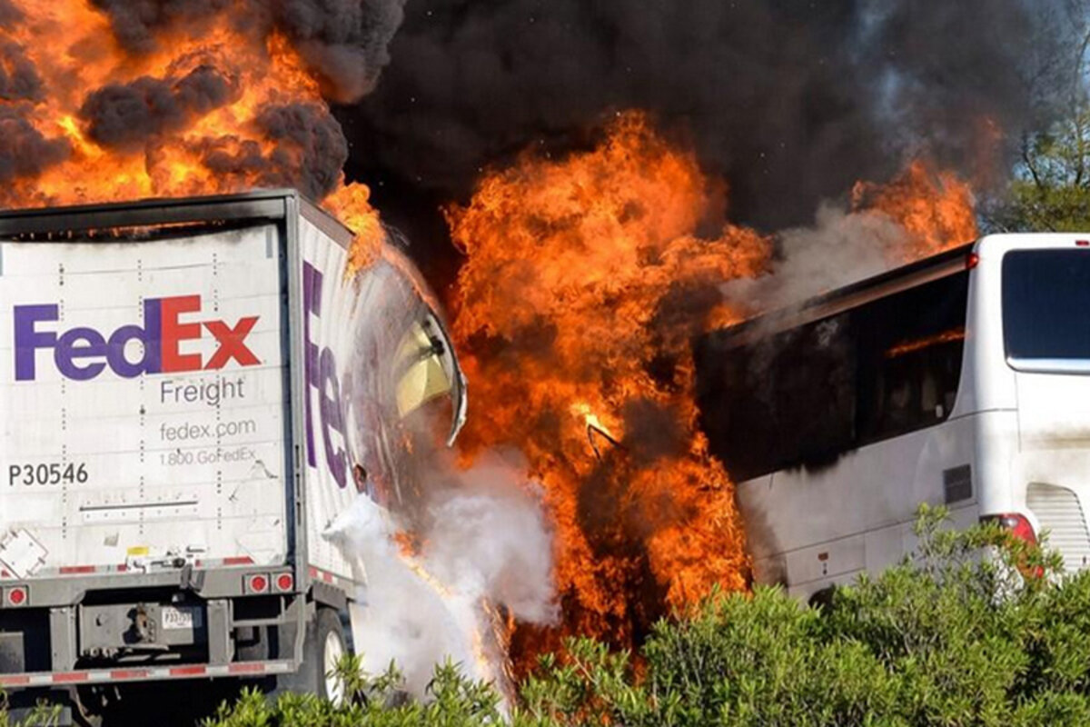 A FedEx tractor-trailer crossed over a grassy median on a Northern California freeway and slammed into a bus carrying more than 40 high school students in an explosive crash that left 10 people dead, authorities said.