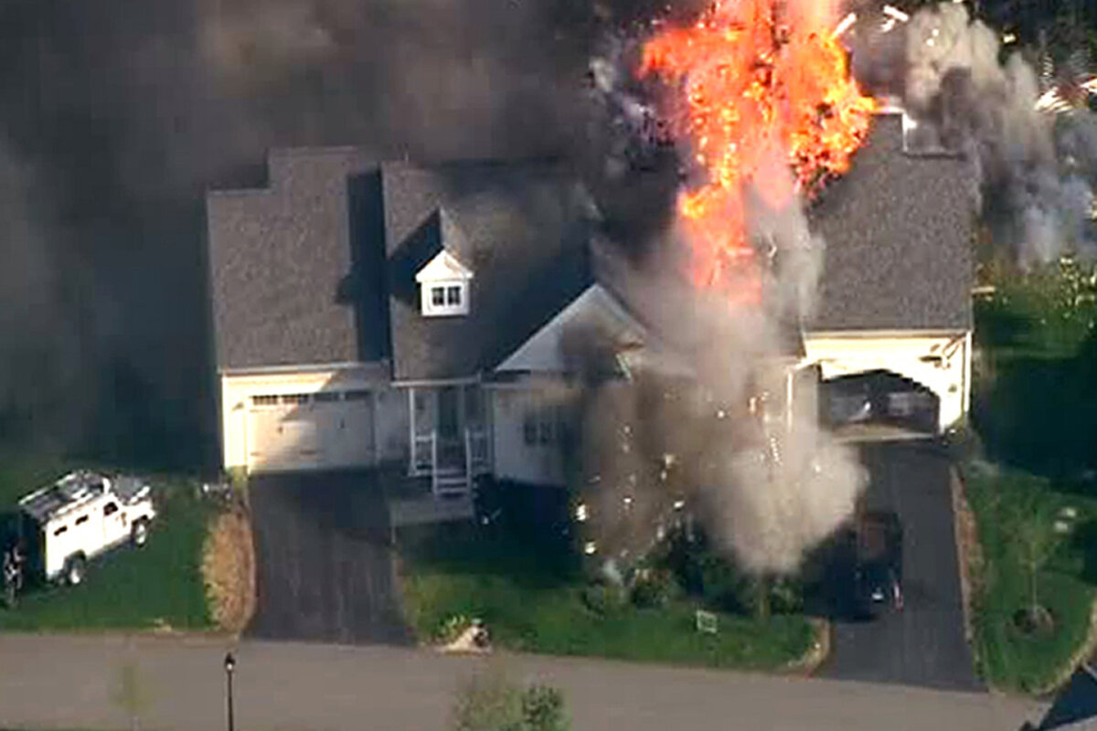 Aerial coverage from WMUR-TV ( ) showed flames burning through the roof of the house and an explosion punching out the front of the house shortly after 5:30 p.m. Within minutes of the explosion, the house was engulfed in flames as black smoke billowed over the neighborhood.