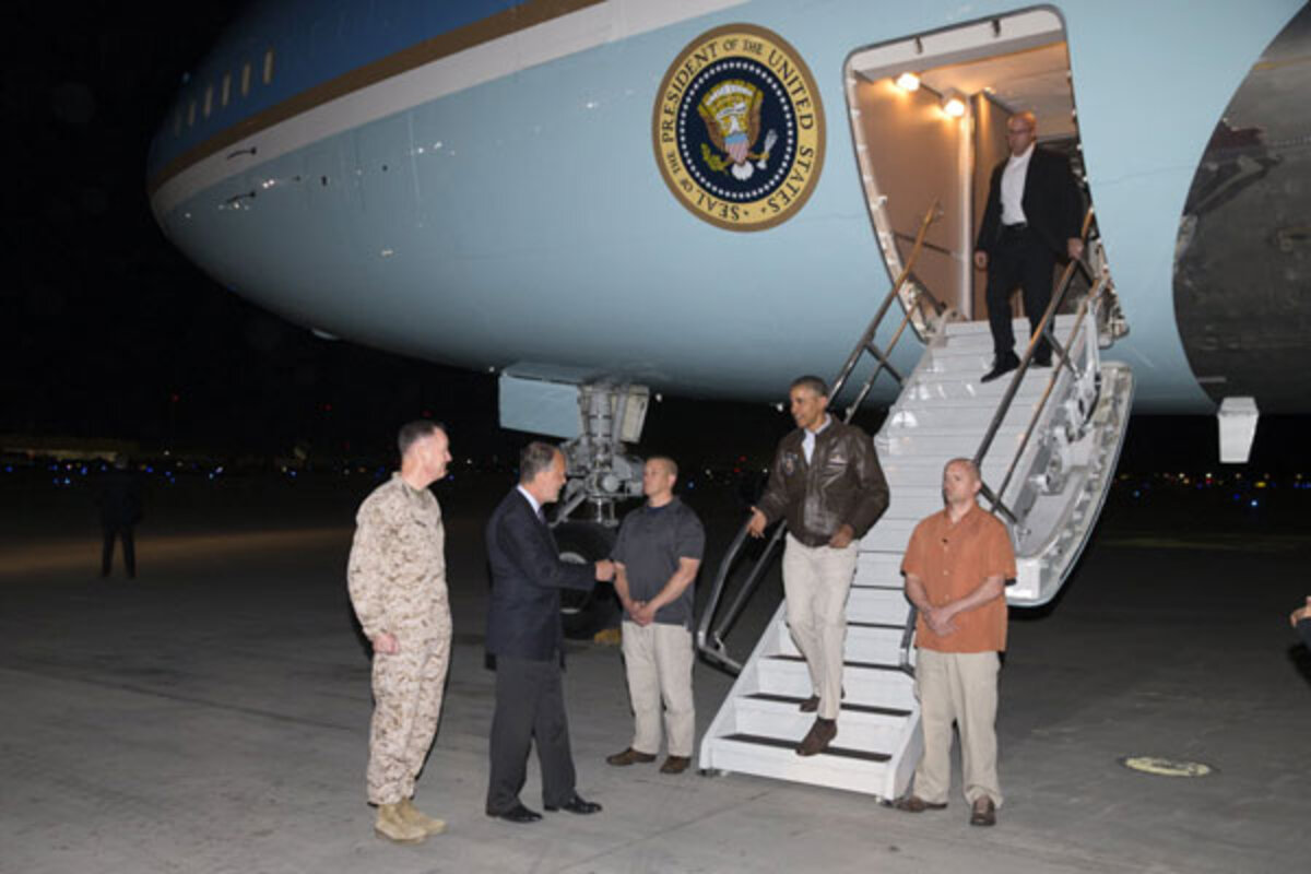 Obama was accompanied by a few advisers, including senior counselor John Podesta, whose son is serving in Afghanistan. Also along was country singer Brad Paisley, who was to perform for U.S. troops.