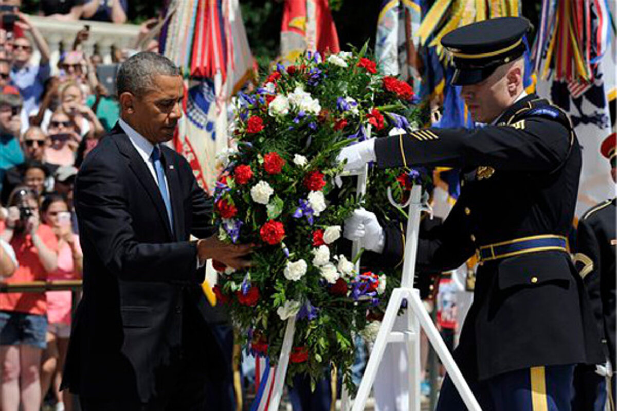 The president was joined by first lady Michelle Obama and Vice President Joe Biden and his wife, Jill, at the solemn ceremony across the Potomac River from White House on the hallowed grounds of Arlington National Cemetery in Virginia. The remembrance was for the war heroes of yesteryear as well as servicemen and women stationed around the world.