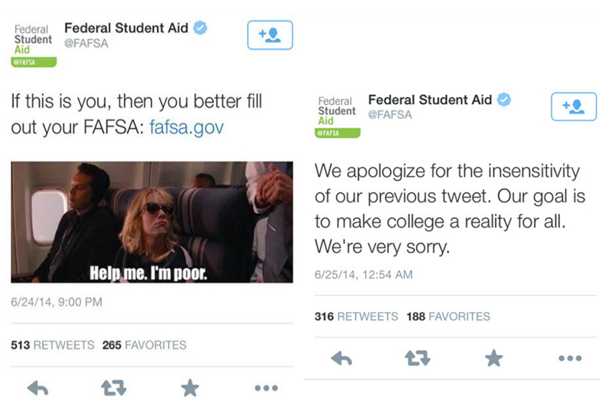 The posting has been removed. A posting on the @FAFSA聽Twitter page now reads, "We apologize for the insensitivity of our previous聽tweet. Our goal is to make college a reality for all. We're very sorry."