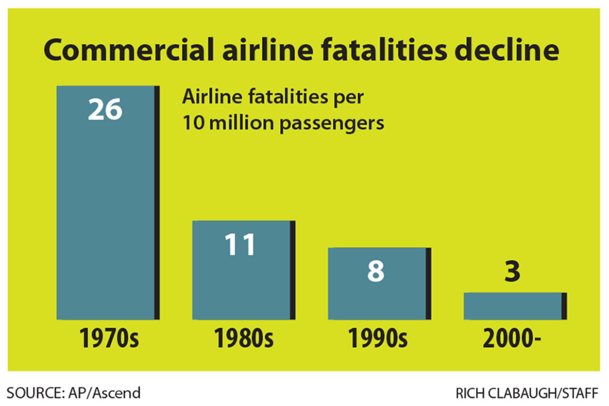 Since 2000, there were less than three fatalities per 10 million passengers, according to an Associated Press analysis of crash data provided by aviation consultancy Ascend. In the 1990s, there were nearly eight; during the 1980s there were 11; and the 1970s had 26 deaths per 10 million passengers.