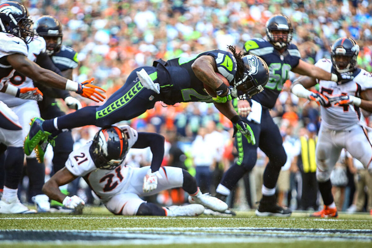 Running back Marshawn Lynch bulldozed his way into the end zone from six yards out to give the Seahawks a 26-20 victory after the Broncos had rallied from a 17-5 deficit in the fourth quarter.