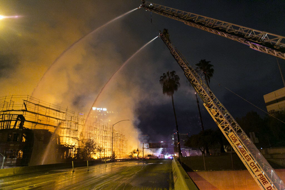 More than 250 firefighters fought a downtown blaze that was sparked at a block-long construction site around 1:20 a.m., Los聽Angeles聽Fire Department Chief Ralph Terrazas said. Flames consumed the 7-story wood-framed structure and damaged two adjacent high-rises before being brought under control within 90 minutes.
