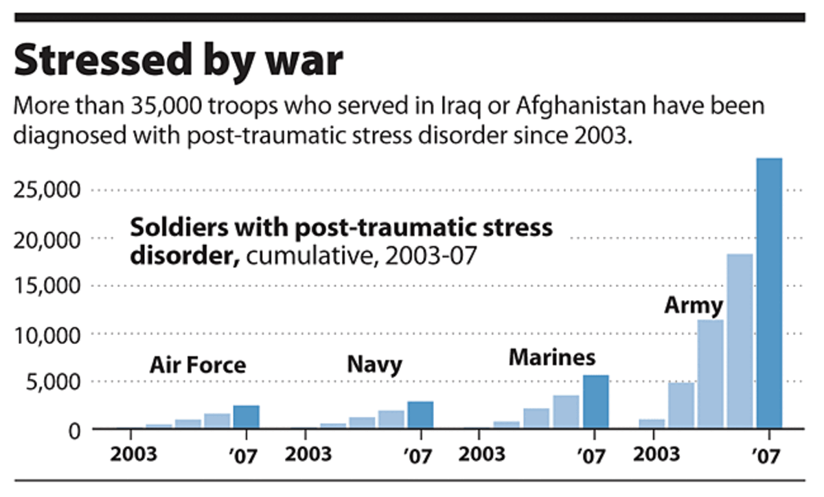 Last year saw the highest rate of suicide among soldiers on record, according to Army data. That year also saw rates of post-traumatic stress disorder (PTSD) diagnosed by the Army jump 50 percent. There have been 172 suicides among all branches of active-duty military while they were assigned to operations in Iraq or Afghanistan as of May 3, according to the Department of Defense.