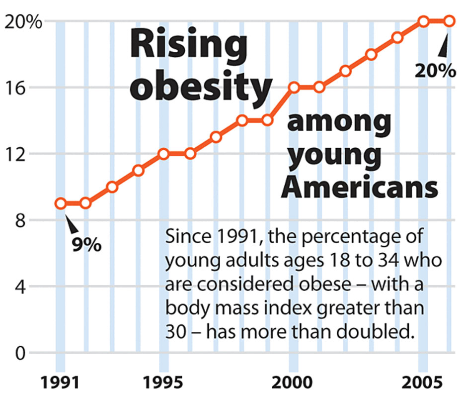 It's no secret that today's youths gobble up french fries and suck down Big Gulps. At the same time, fewer are getting exercise. The percentage of young adults considered obese 鈥 with a BMI greater than 30 鈥 has grown sharply in recently years.