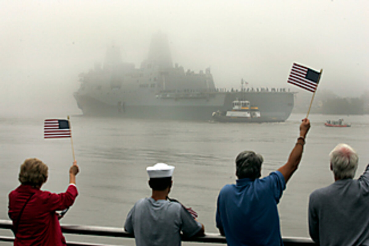 The was built with 7.5 tons of steel salvaged from the 9/11 attack on the World Trade Center. The ship, which can carry up to 800 Marines, is on its way to New York where it will be formally commissioned in early November.