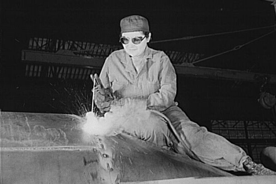 War production workers at the Heil Company making gasoline trailer tanks in Milwaukee, Wis. for the US Army Air Corps. Enola O'Connell, age thirty-two, widow and mother of one child, welding part of a trailer.