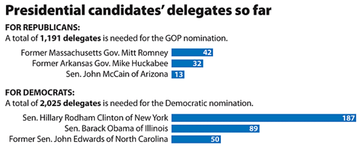 So far, Mr. Romney leads with 42 delegates, followed by Mr. Huckabee (32) and Mr. McCain (13). In the Democratic field, Sen. Hillary Rodham Clinton of New York leads with 187 delegates, followed by Sen. Barack Obama of Illinois (89) and former Sen. John Edwards of North Carolina (50). But wins in big-delegate states by any of the candidates could render those early totals meaningless. California alone offers 441 delegates to the Democrats and 173 to the Republicans. To win the nomination, a Democrat needs 2,025 delegates and a Republican needs 1,191.