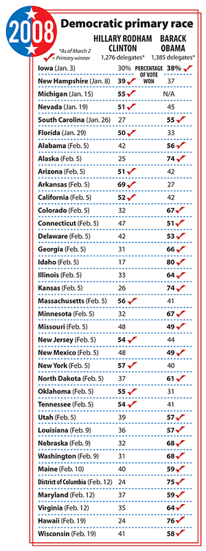 On the latest Super Tuesday, March 4, if Hillary Rodham Clinton is able to win both states and slow Barack Obama's momentum toward the Democratic nomination, she will live to fight another day. The next big showdown will be April 22 in Pennsylvania.
