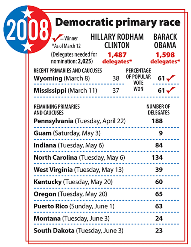 Obama aides are also downplaying the significance of Pennsylvania, where Clinton is heavily favored. "We'll campaign hard there," his campaign manager, David Plouffe, said in a conference call with reporters Wednesday. "But our campaign won't be defined by Pennsylvania."