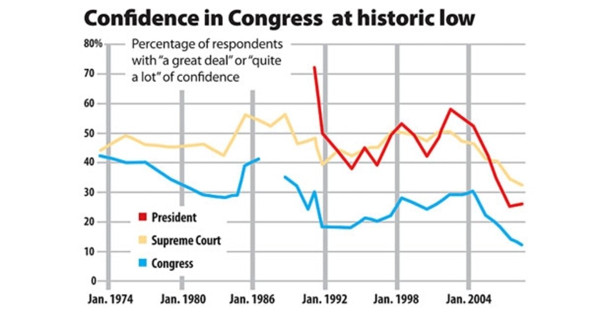A recent Gallup Poll confirms what many lawmakers say they're hearing from their constituents: that confidence in Congress has never been lower. Only 12 percent of Americans say they have a "great deal" or "quite a lot" of confidence in Congress as an institution 鈥 the lowest level ever for any US institution since Gallup began asking the question 35 years ago. Congressional job approval, a slightly different question, has dropped to 18 percent.