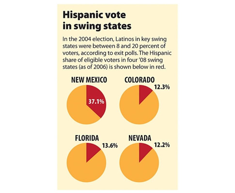 Despite the low number, this potential swing vote is concentrated in a few hotly contested states. Senator Obama last week was blunt about Hispanics' importance: "This election could well be decided by Latino voters." In the 2004 election, 40,000 Latinos registered to vote in New Mexico didn't turn out, and Democrat John Kerry lost the state by fewer than 6,000 votes.