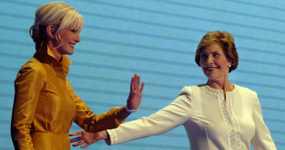 Only a few hours later, First Lady Laura Bush and First Lady nominee Cindy made a surprise joint appearance at which they repeated the GOP鈥檚 mantra of the moment.